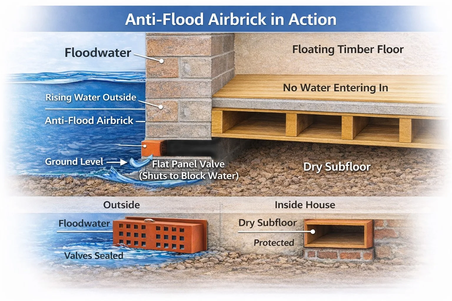 These systems are particularly beneficial for properties located within flood-risk zones, flood plains, or areas susceptible to surface water flooding, such as those near rivers, low-lying land, or locations with overwhelmed drainage infrastructure during heavy rainfall. By preventing water from entering the subfloor void, anti-flood air bricks help protect timber floor structures, joists, insulation, and internal finishes from moisture damage, rot, and mould growth that can occur following flooding.